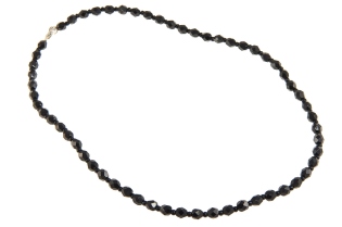 Naszyjnik w kolorze srebrnym, ozdobiony pięknie mieniącym się kamieniem.