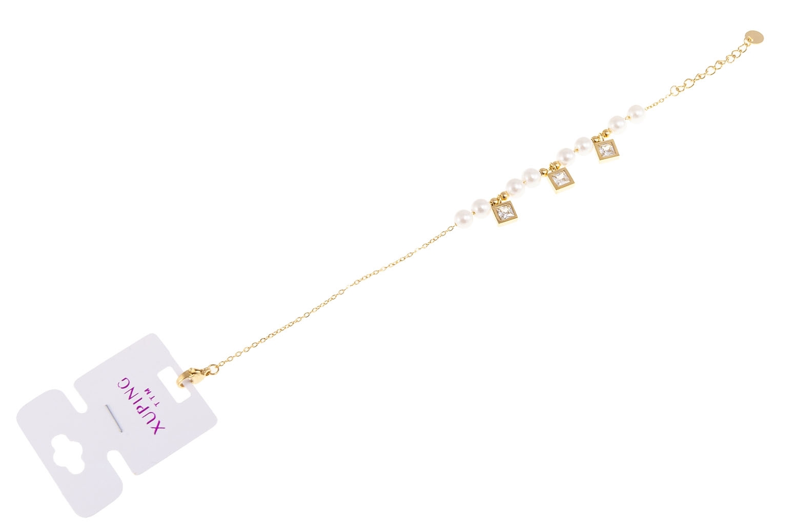 Elegancka złota bransoletka, ozdobiona pięknie błyszczącymi się dżetami i perełkami.Wymiary bransoletki: