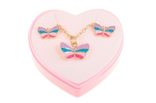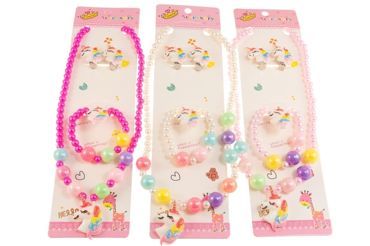 Komplet biżuterii dziecięcej, składający się z naszyjnika, bransoletki, pierścionka i klipsów.