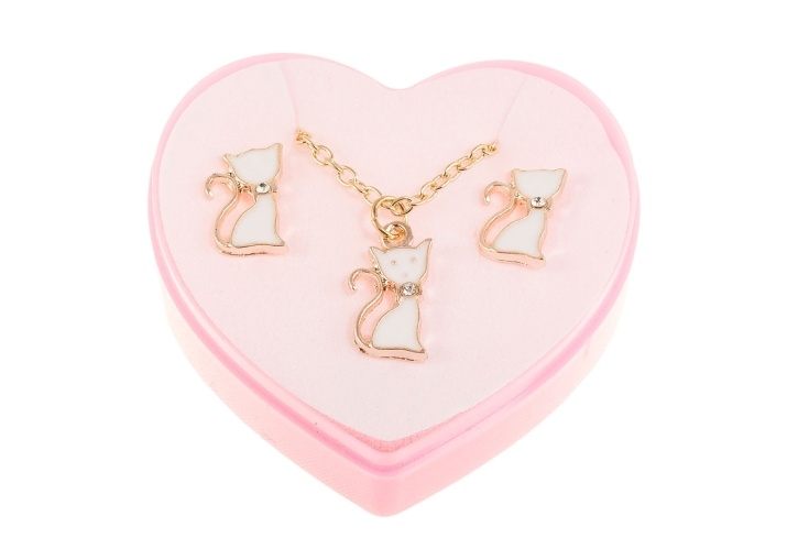 Komplet biżuterii dziecięcej, składający się z naszyjnika i kolczyków w kaształcie kotków.Biżuteria w kolorze złotym ozdobiona białą emalią.