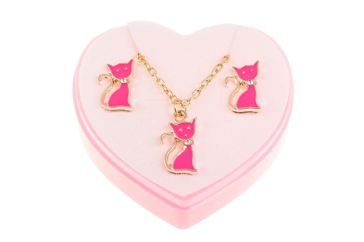 Komplet biżuterii dziecięcej, składający się z naszyjnika i kolczyków w kaształcie kotków.