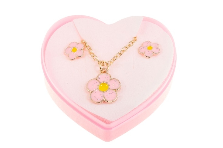 Komplet biżuterii dziecięcej, składający się z naszyjnika i kolczyków w kaształcie kwiatków.