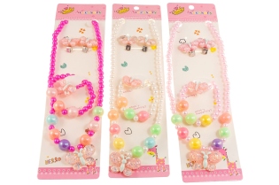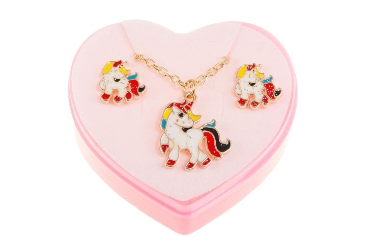 Komplet biżuterii dziecięcej, składający się z naszyjnika i kolczyków w kaształcie jednorożców.Biżuteria w kolorze złotym ozdobiona kolorową emalią.