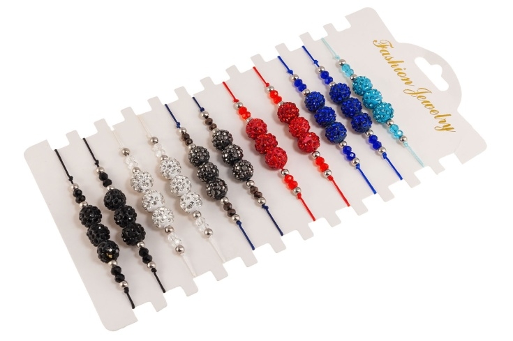 Kolorowe bransoletki, składające się ze sznurków i ozdoby.