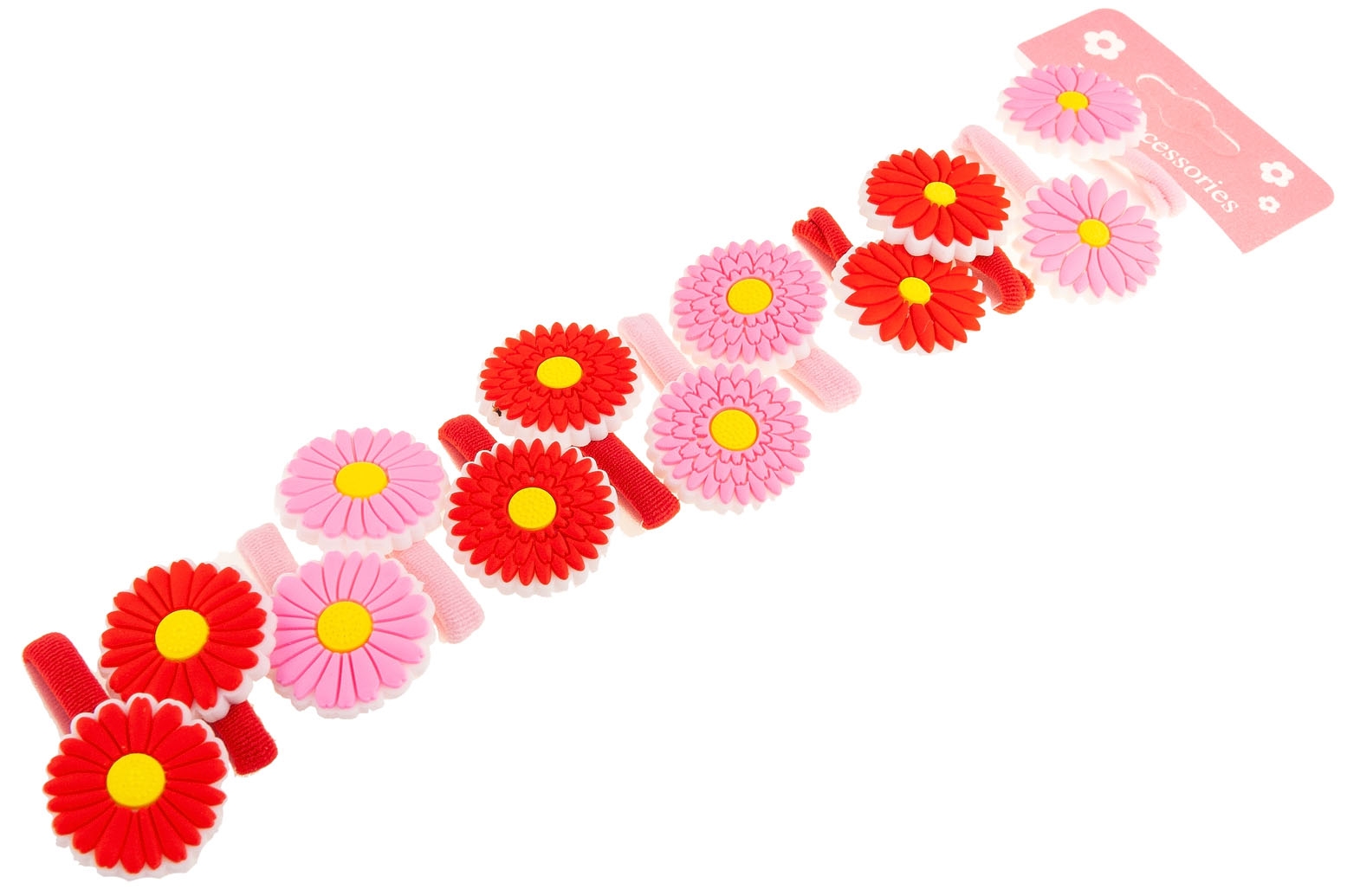 Klasyczne gumki do włosów z uroczą ozdobą w kształcie kwiatka.Zestaw składa się z dwóch kolorów: różowy i czerwony.