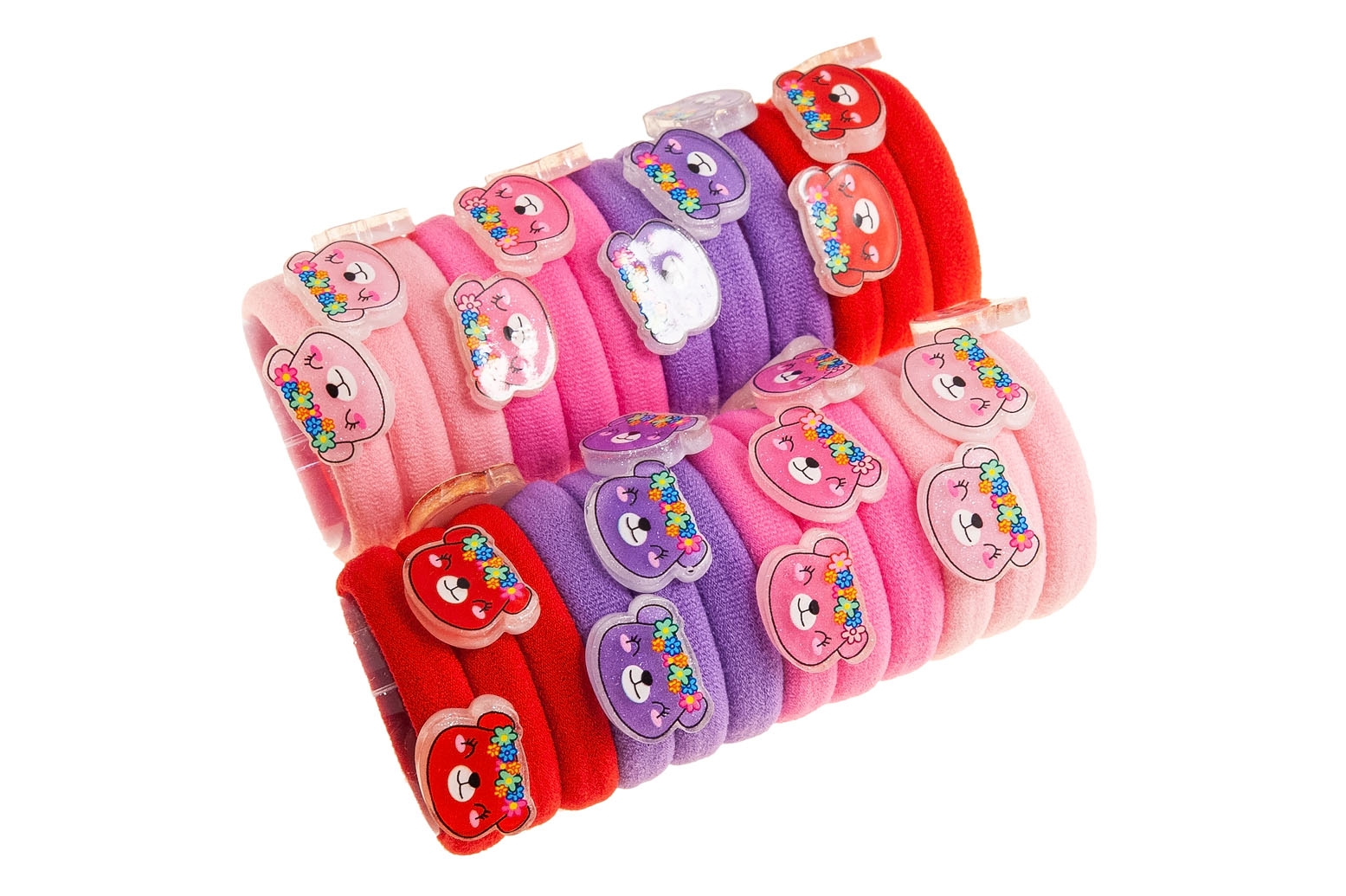 Klasyczne gumki do włosów z uroczą ozdobą w kształcie misia.Zestaw składa się z czterech kolorów: fioletowy, czerwony, jasny i ciemny różowy.