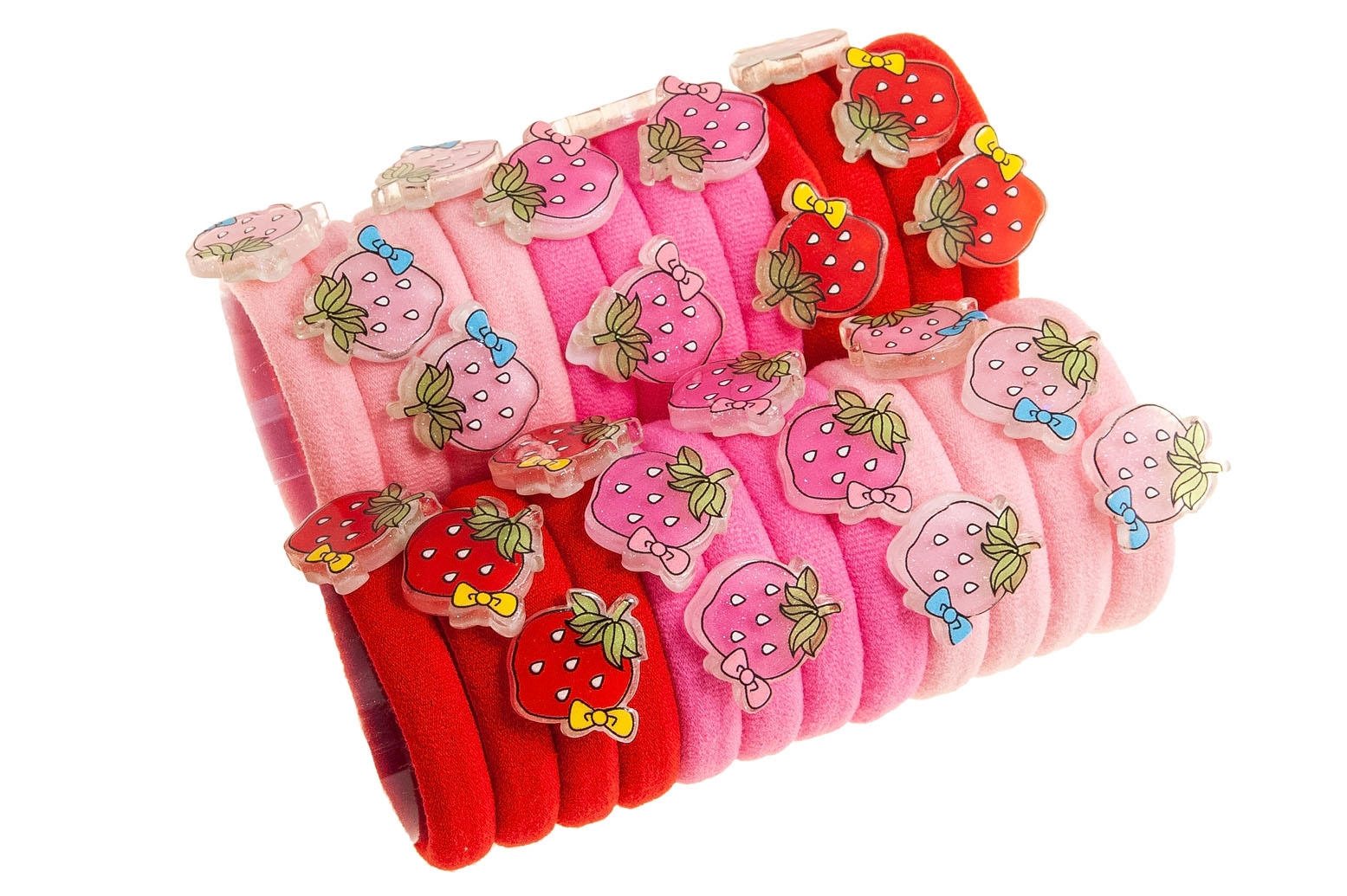 Klasyczne gumki do włosów z uroczą ozdobą w kształcie truskawki.Zestaw składa się z czterech kolorów: fioletowy, czerwony, jasny i ciemny różowy.
