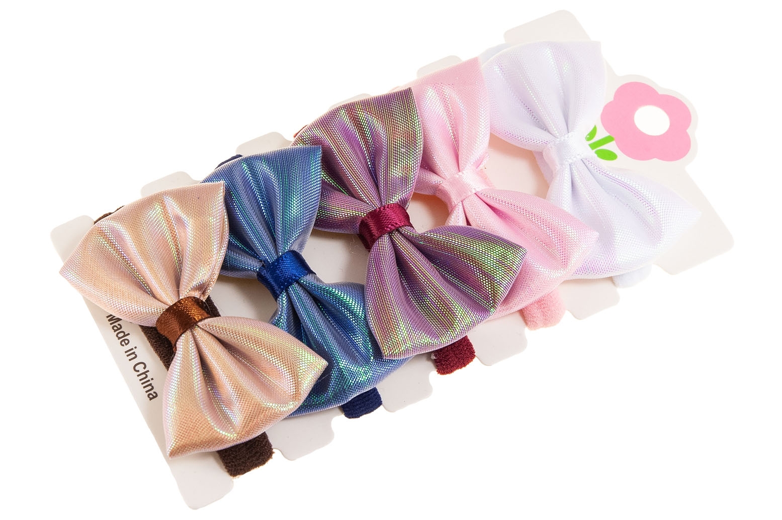 Klasyczne gumki do włosów z uroczą ozdobą w kształcie kokardki. Kokardki pięknie się mienią.