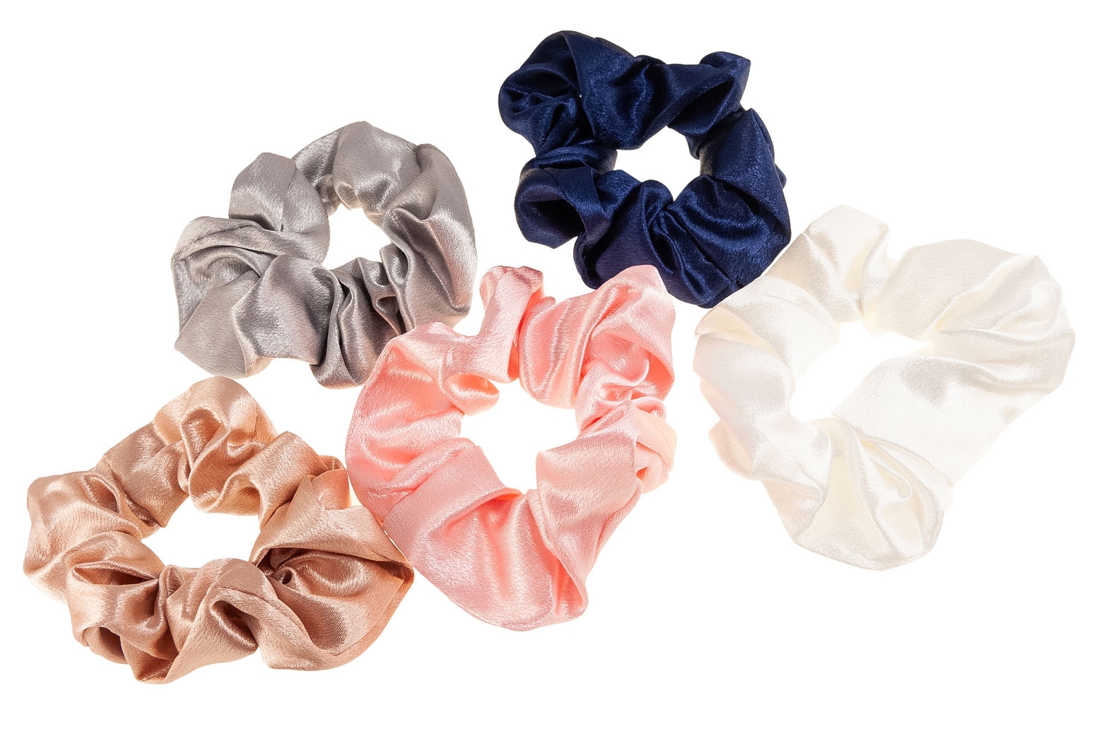 Modna gumka do włosów, wykonana z mieniącego się materiału.Zestaw składa się z pięciu kolorów: biały, różowy, beżowy, granatowy i szary.