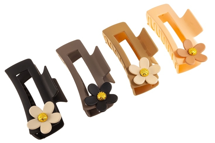 Duże spinki do włosów wykonane z wytrzymałego materiału. Spinki ozdobione są uroczym kwiatkiem.