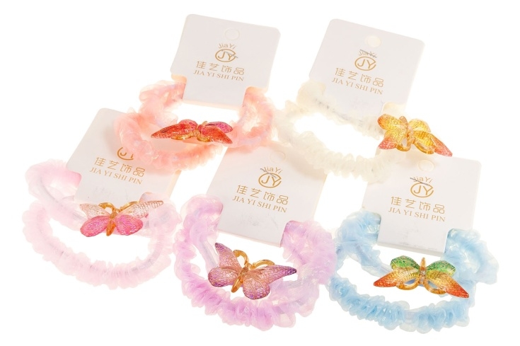 Eleganckie gumki do włosów. Gumki obszyte są materiałem i posiadają uroczą ozdobę w kształcie motylka.Zestaw składa się z pięciu kolorów: biały, morelowy, różowy, fioletowy i niebieski.