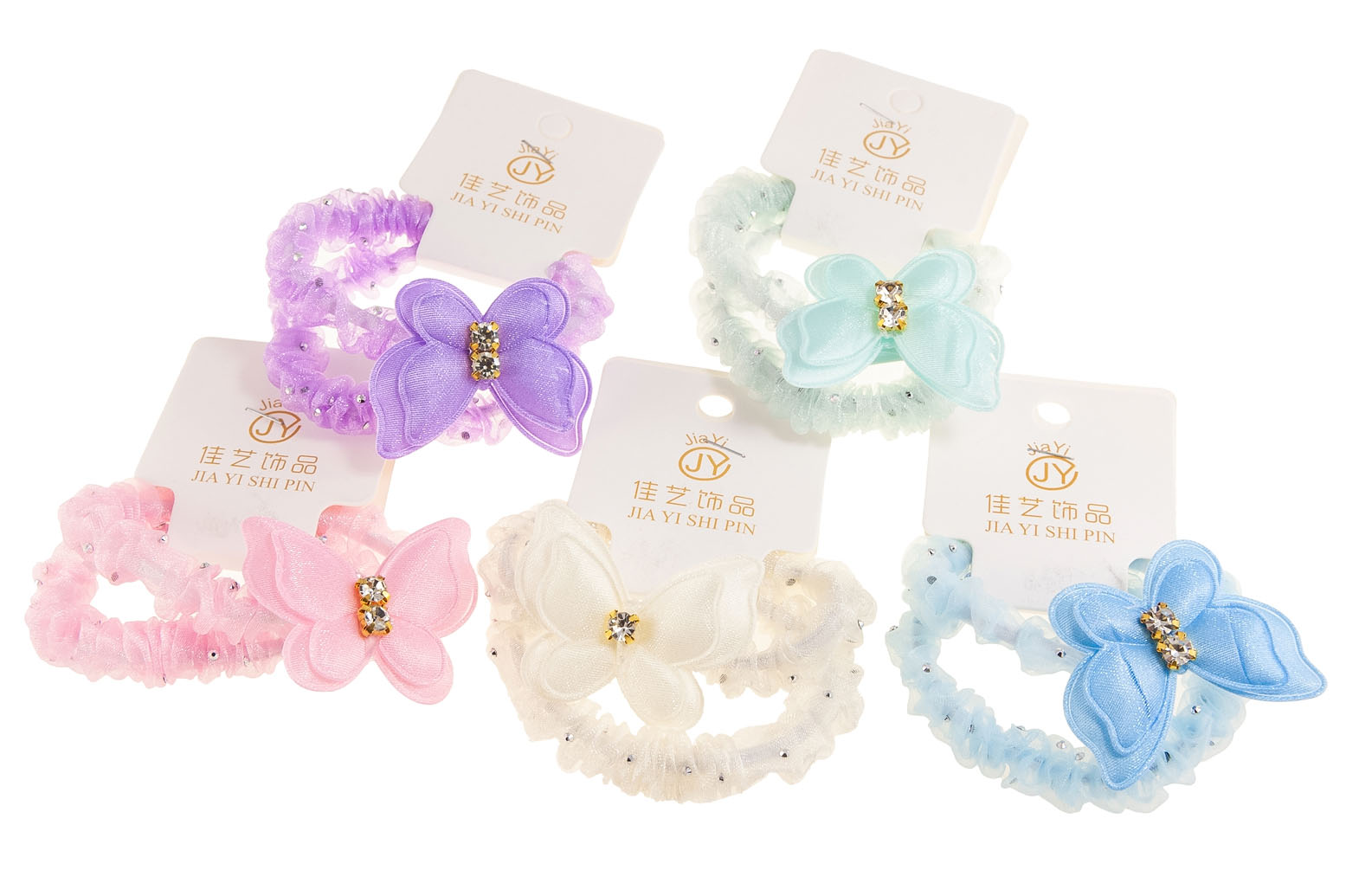 Eleganckie gumki do włosów. Gumki obszyte są materiałem i posiadają uroczą ozdobę w kształcie motylka.Zestaw składa się z pięciu kolorów: biały, różowy, fioletowy, jasny i ciemny niebieski.