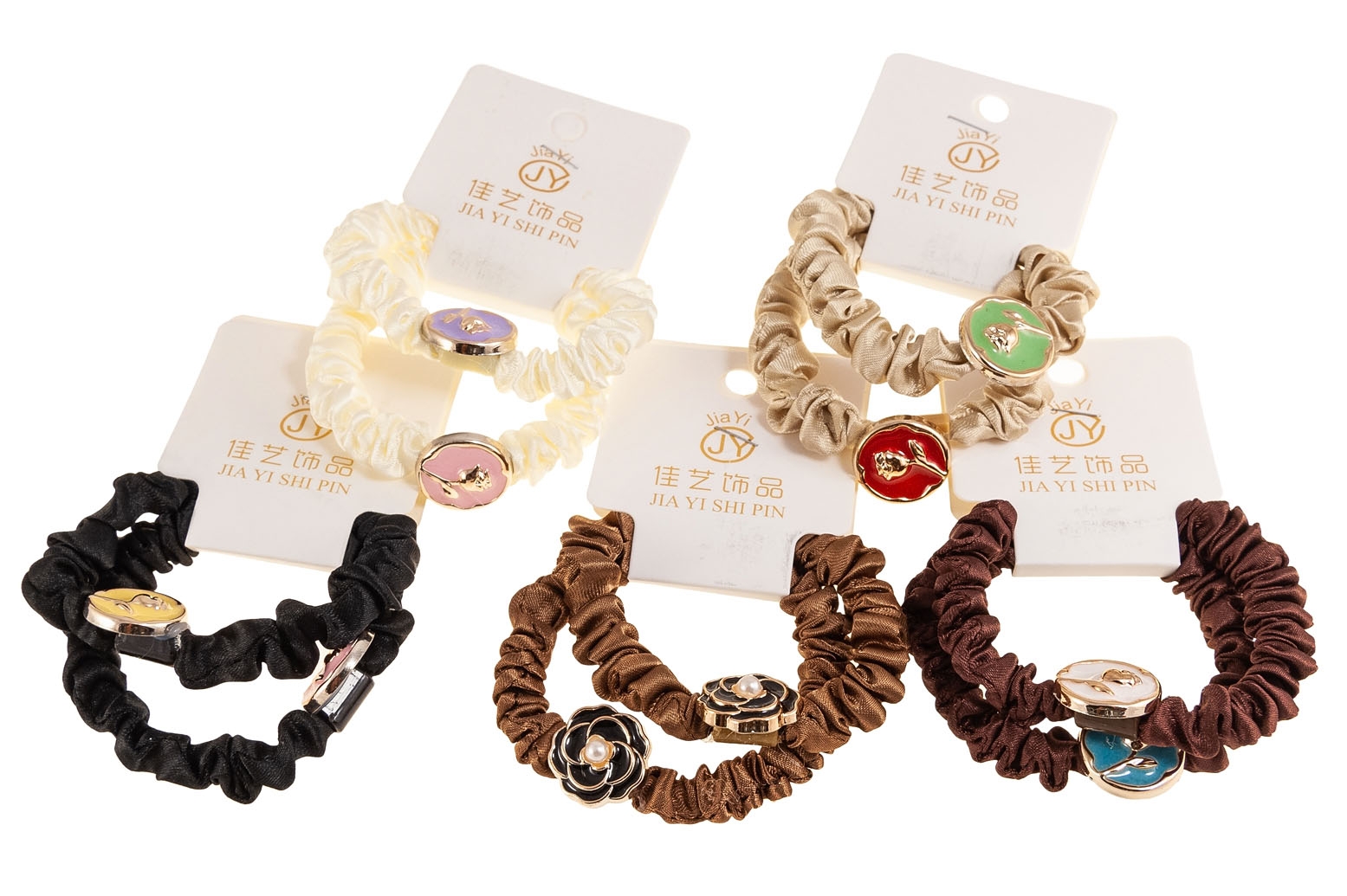Eleganckie gumki do włosów. Gumki obszyte są materiałem i posiadają ozdobę w kształcie kwiatków.Zestaw składa się z pięciu kolorów: ecru, beżowy, czarny, jasny i ciemny brązowy.