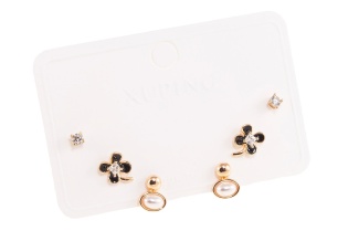 Zestaw trzech delikatnych kolczyków. Kolczyki w kolorze złotym, ozdobione są perełkami, czarną emalią i szlifowanymi kamieniami.Wymiary kolczyków: