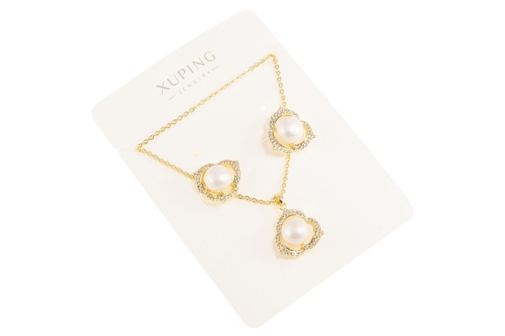 Elegancki komplet, składa się z kolczyków i naszyjnika. Komplet w kolorze złotym, ozdobiony jest perełkami i szlifowanymi kamieniami.Wymiary: