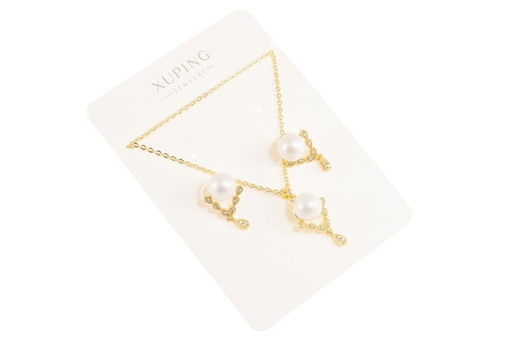 Elegancki komplet, składa się z kolczyków i naszyjnika. Komplet w kolorze złotym, ozdobiony jest perełkami i szlifowanymi kamieniami.Wymiary: