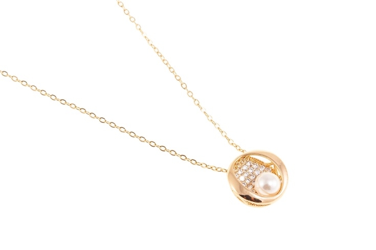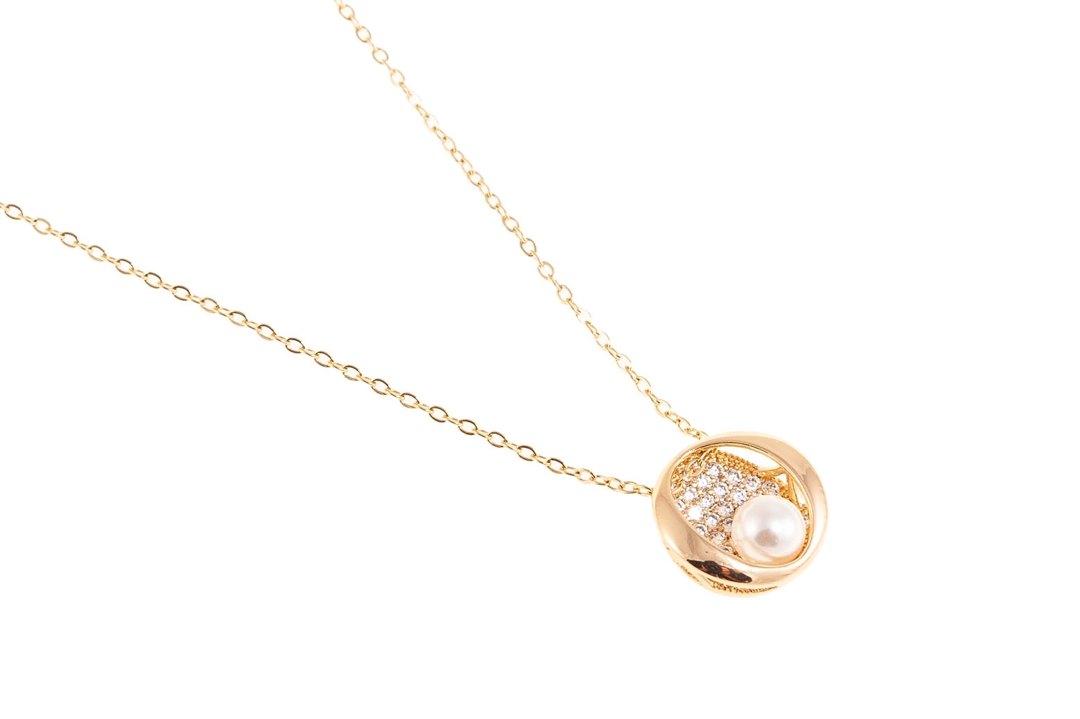 Elegancki, złoty łańcuszek z piękną przywieszką ozdobioną perełką i dżetami.Wymiary naszyjnika: