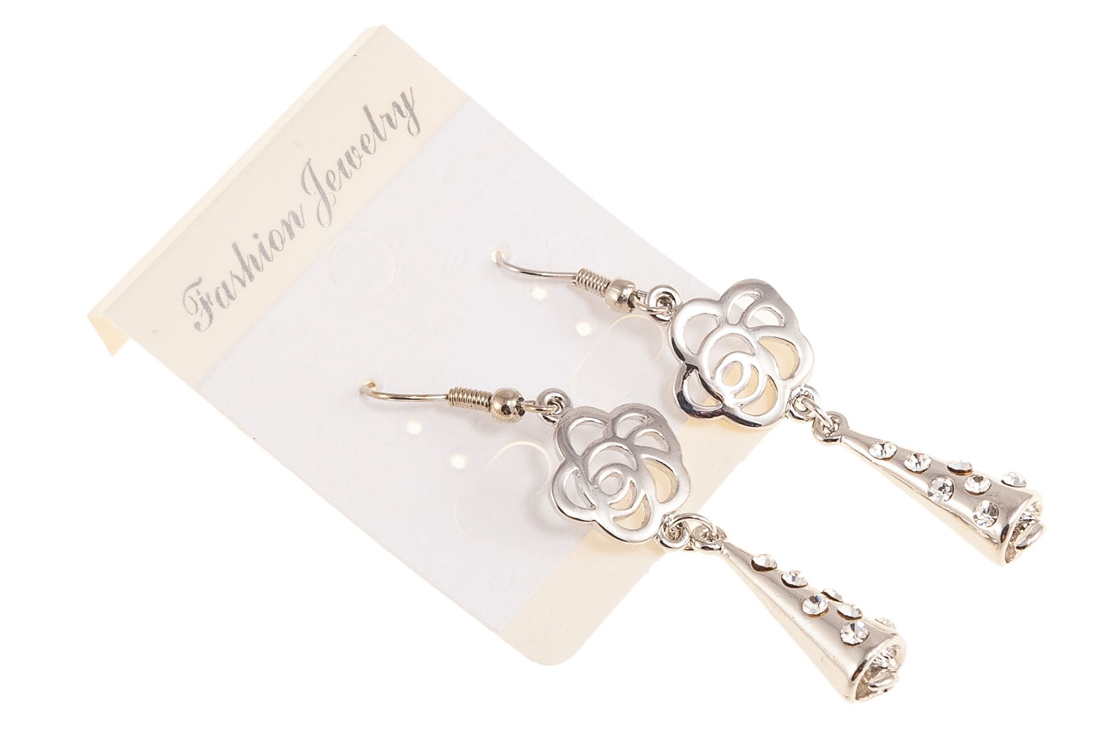 Eleganckie wiszące kolczyki w kolorze srebrnym z ozdobnymi przywieszkami.