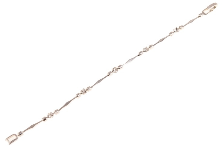 Elegancka bransoletka w kolorze srebrnym, ozdobiona szlifowanymi kamieni.