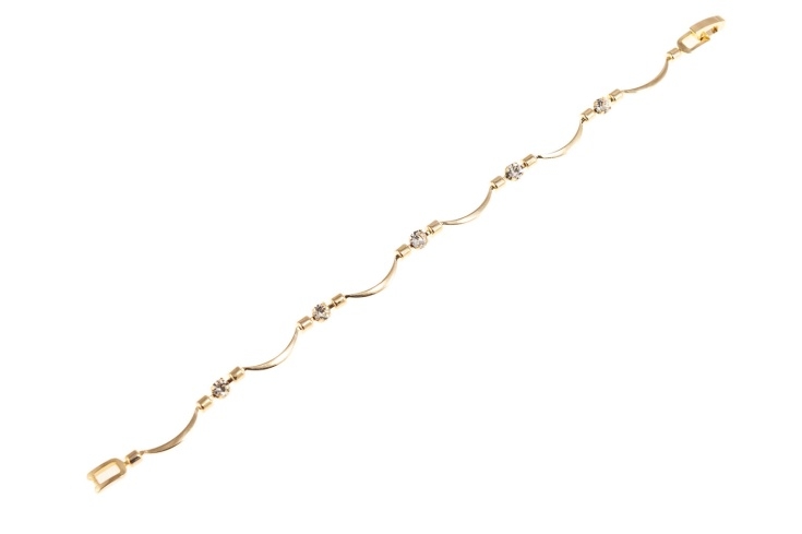 Elegancka bransoletka w kolorze złotym, ozdobiona szlifowanymi kamieni.