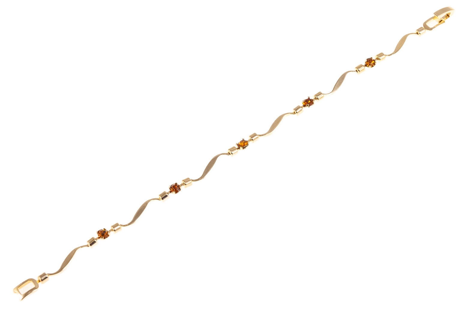 Elegancka bransoletka w kolorze złotym, ozdobiona szlifowanymi kamieni.