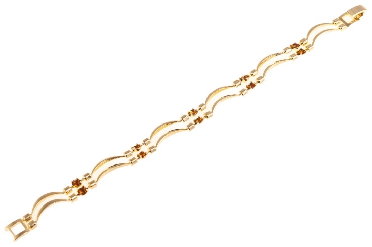 Elegancka bransoletka w kolorze złotym, ozdobiona szlifowanymi kamieni.