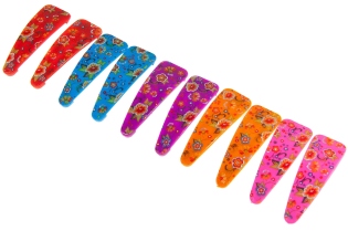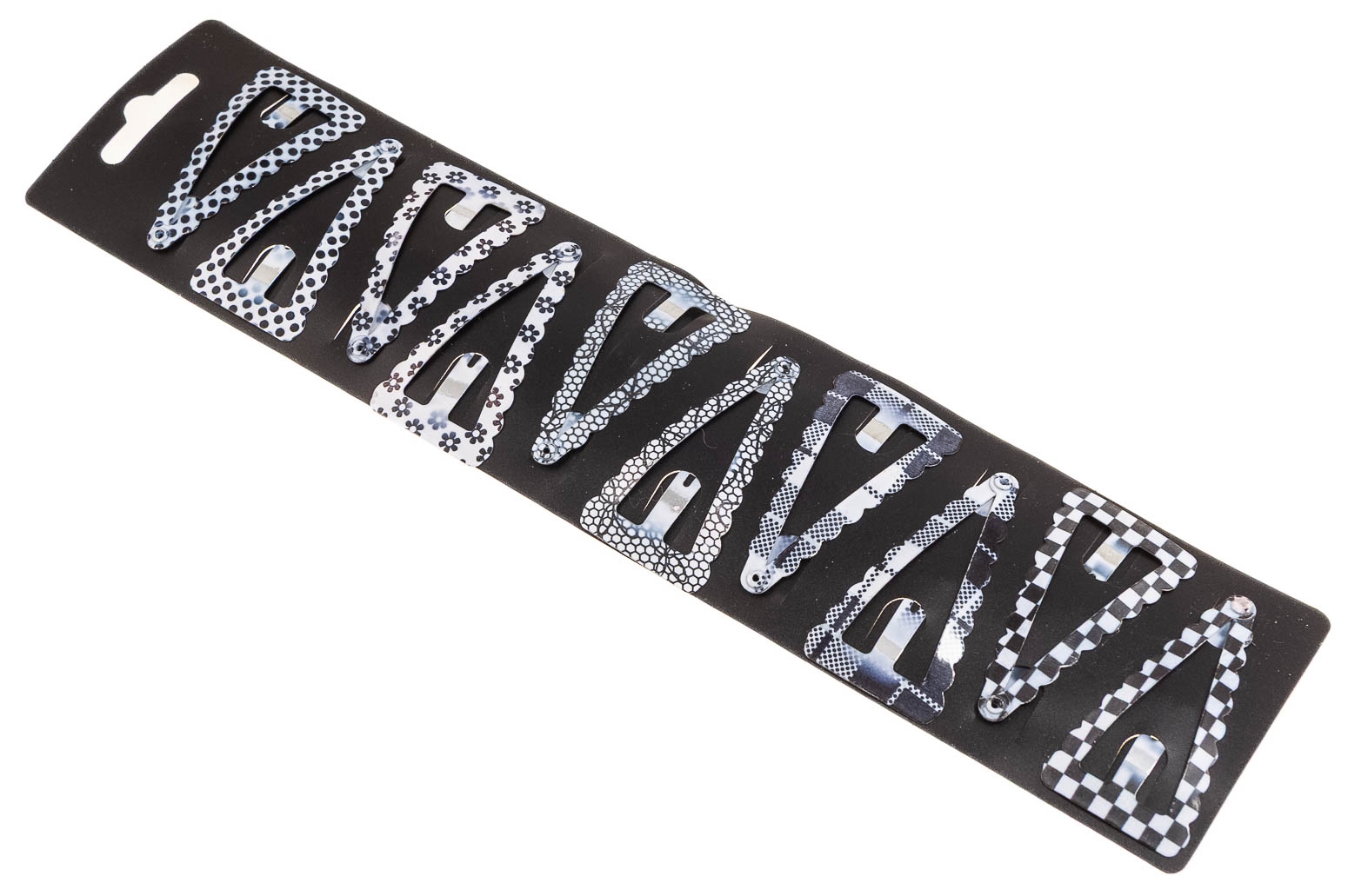 Trójkątne spinki do włosów, wykonane z metalu. Spinki są ozdobione uroczymi nadrukami.