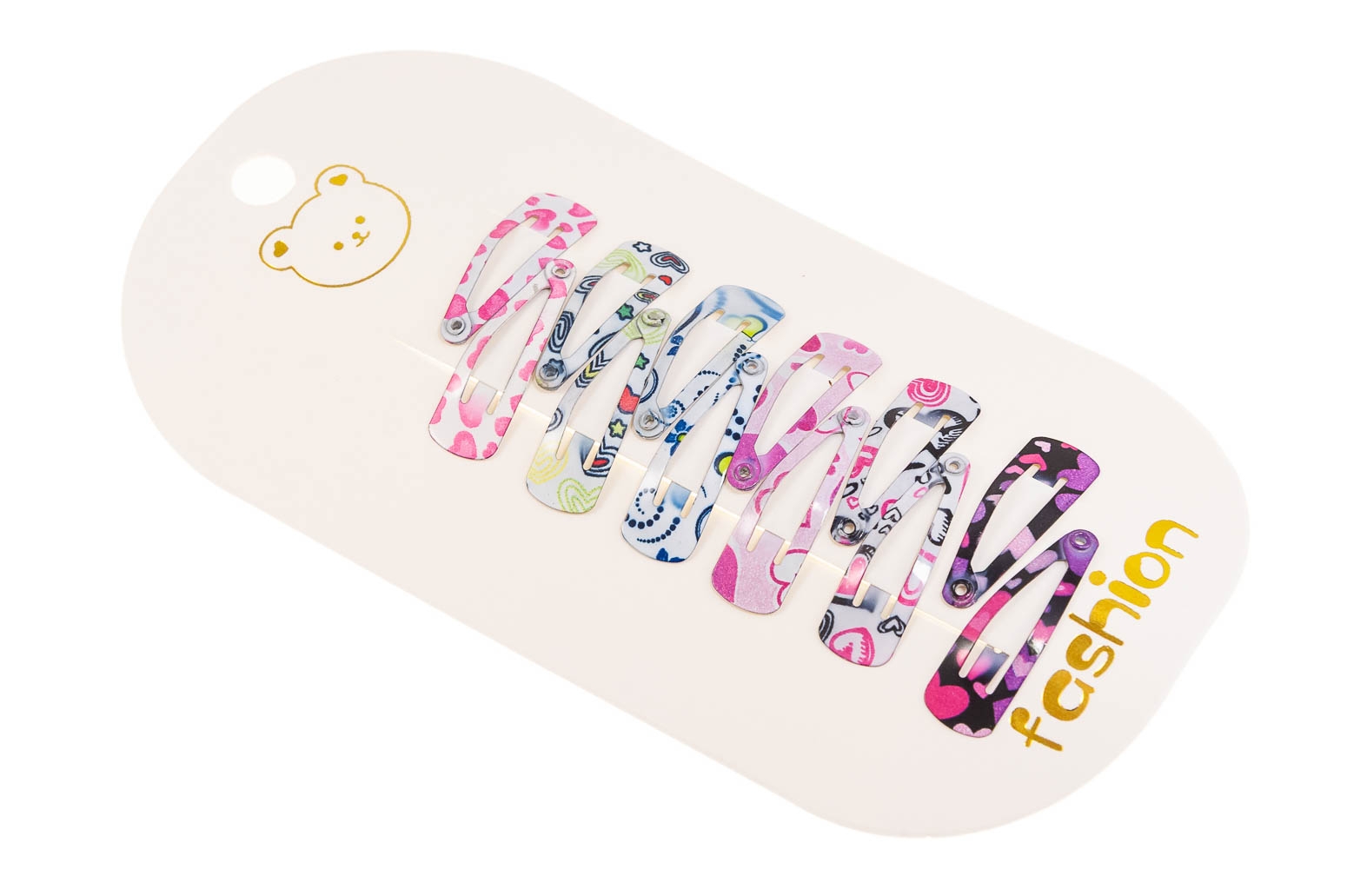 Mini spinki do włosów, wykonane z metalu. Spinki są ozdobione uroczymi nadrukami.