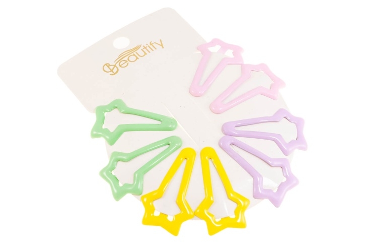 Klasyczne spinki do włosów, wykonane z metalu, pokryte emalią.Zestaw składa się z czterach kolorów: zielony, żółty, fioletowy i różowy.