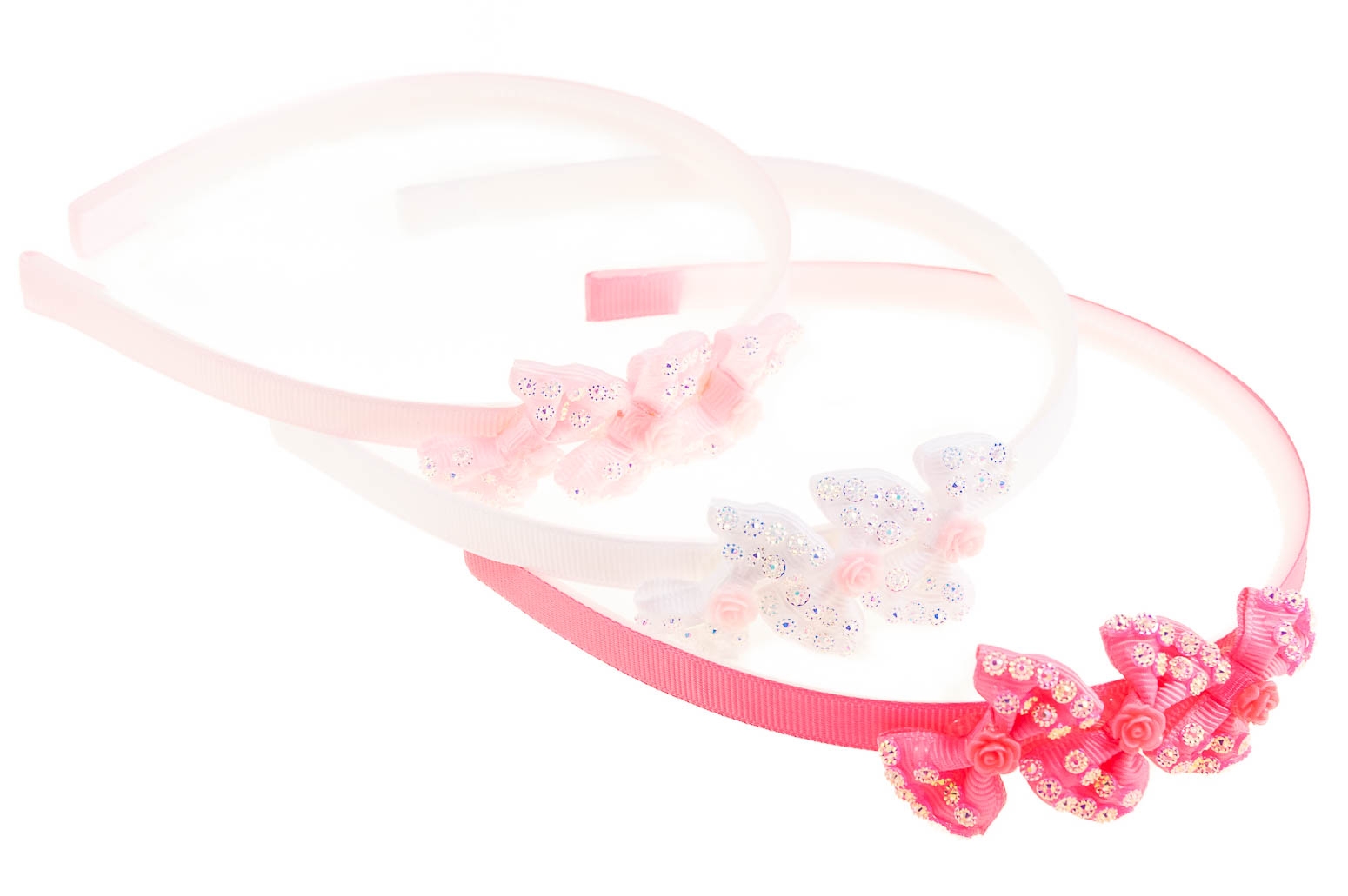 Opaska pokryta materiałem, ozdobiona materiałową kokardką.