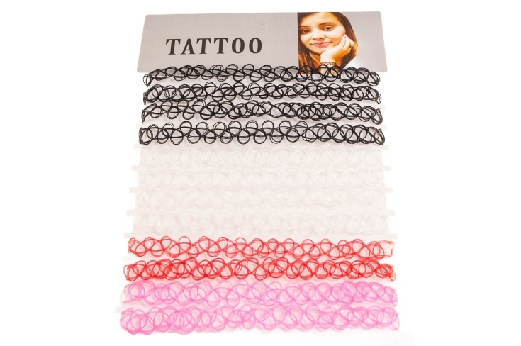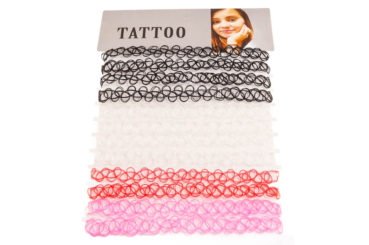 Pleciony naszyjnik - choker. Naszyjnik imituje tatuaż.Zestaw składa sie czterech kolorów: czarny, biały, czerwony i różowy.