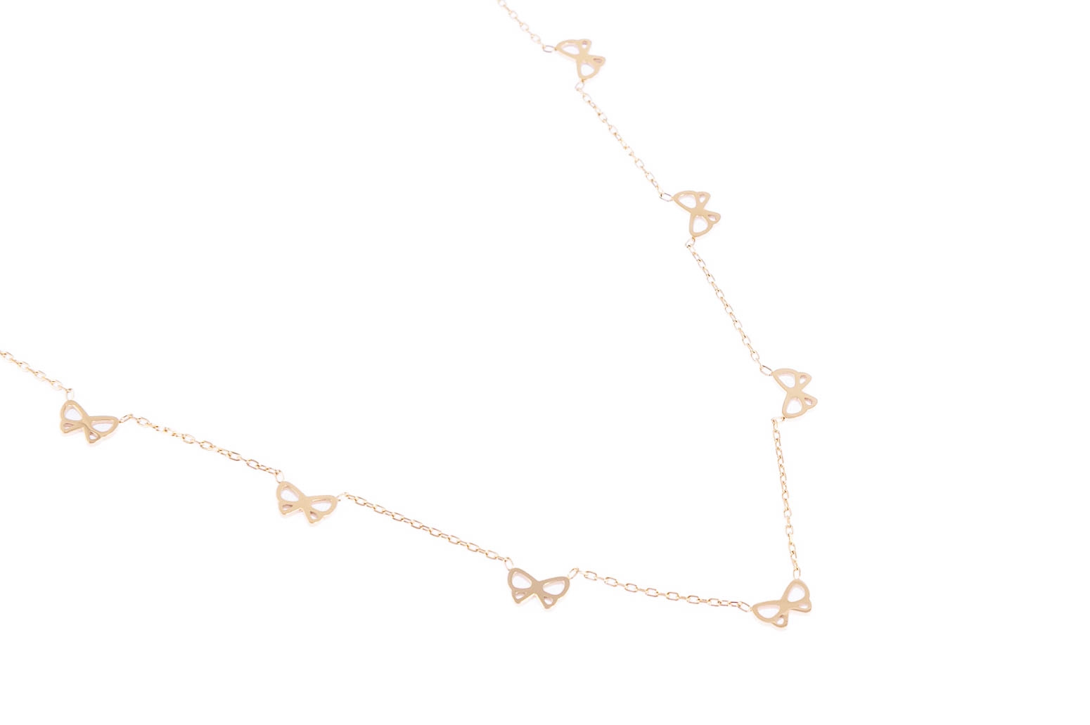 Elegancki łańcuszek z uroczymi przywieszkami w kształcie kokardek. Naszyjnik jest w kolorze złotym.Wymiary naszyjnika: