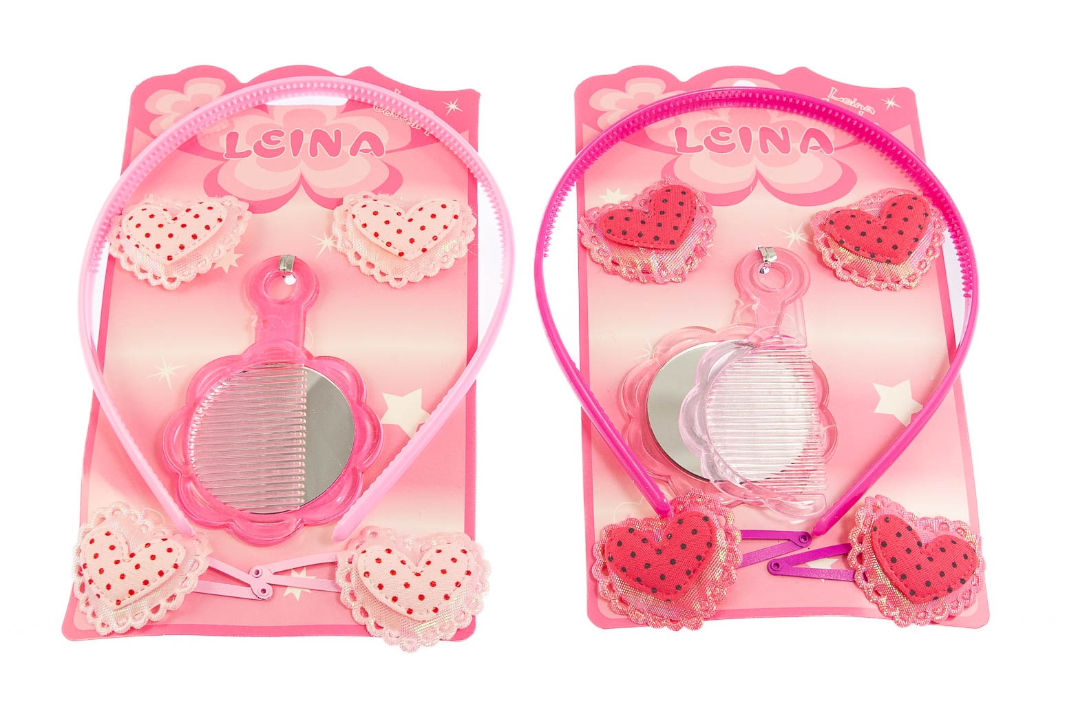 Urocze zestawy ozdób do włosów.Zestaw składa się z pary gumeczek i spinek, opaski oraz lusterka z grzebykiem. Gumki i spinki ozdobione są serduszkami w kropeczki.