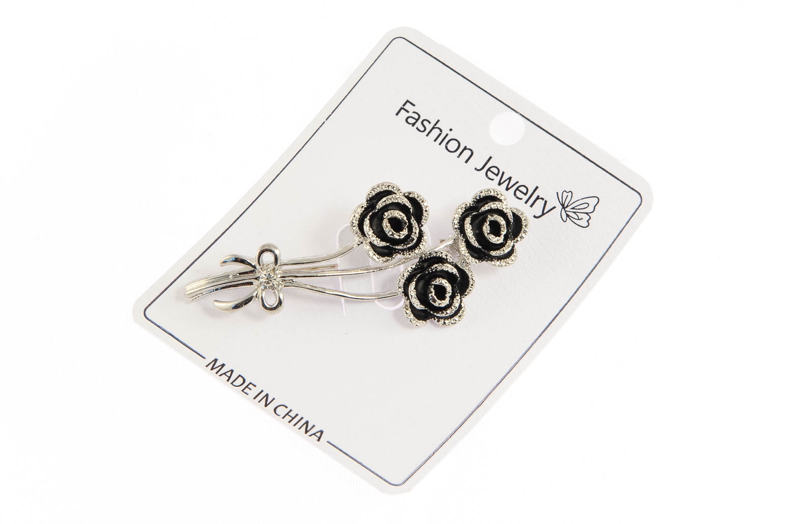 Elegancka broszka w kształcie różyczek. Przywieszka w kolorze srebrnym, ozdobiona czarnymi elementami.