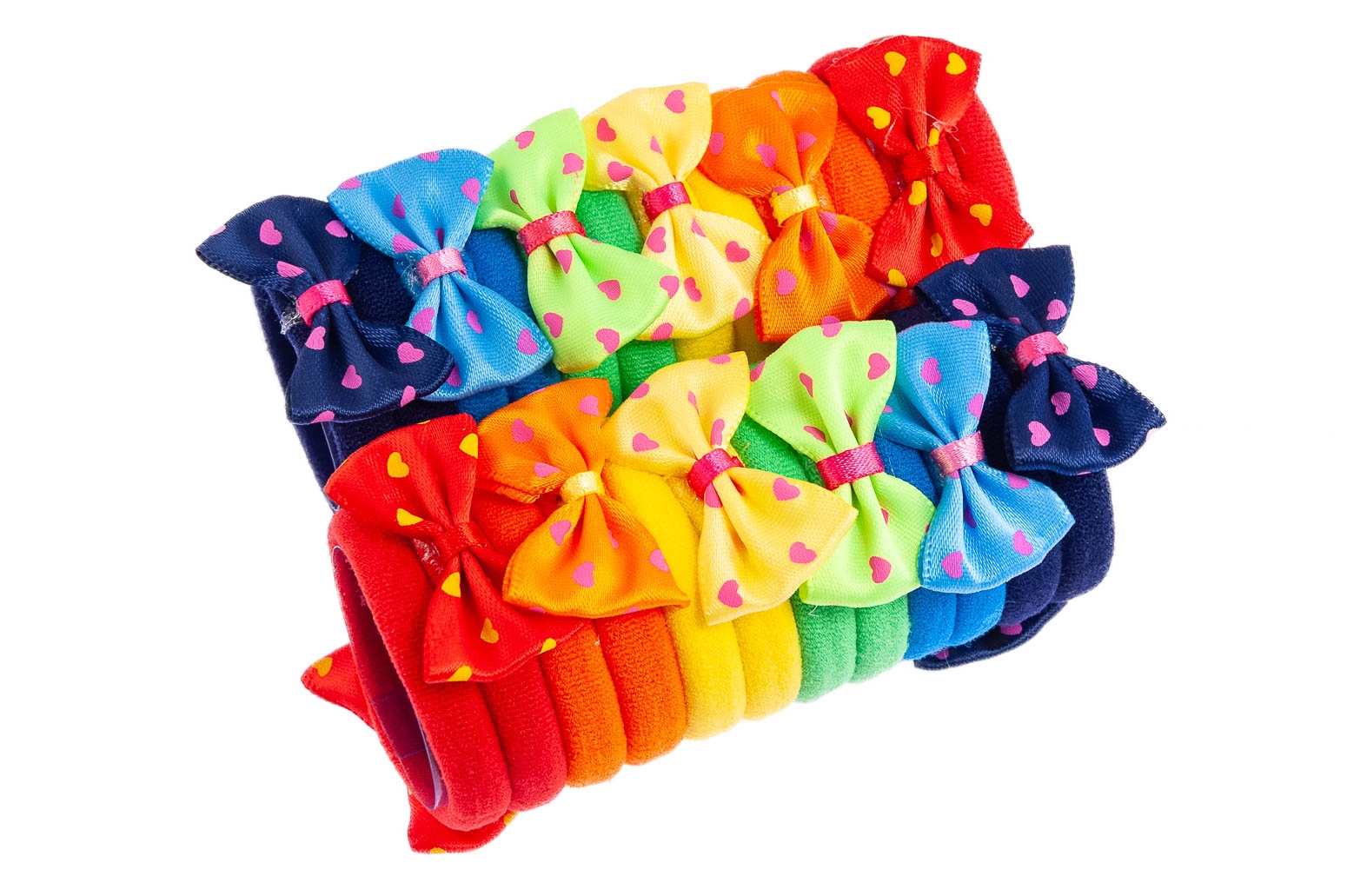 Klasyczne gumki do włosów z uroczą ozdobą w kształcie kokardki.Zestaw składa się z sześciu kolorów: granatowy, niebieski, zielony, żółty, pomarańczowy i czerwony.