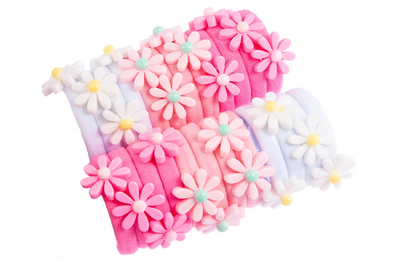 Klasyczne gumki do włosów z uroczą ozdobą w kształcie stokrotki.Zestaw składa się z trzech kolorów: biały, jasny i ciemny różowy.