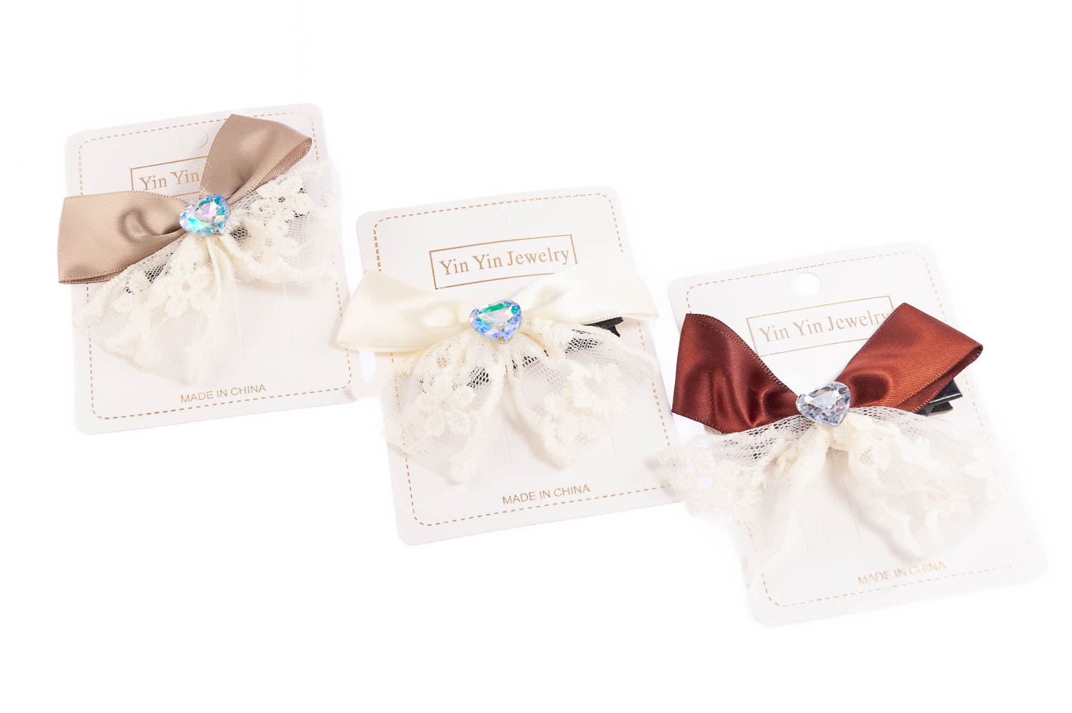Klasyczne spinki z elegancką kokardą i szlifowanym serduszkie,.Zestaw składa się z trzech kolorów: beżowy, biały i brązowy.