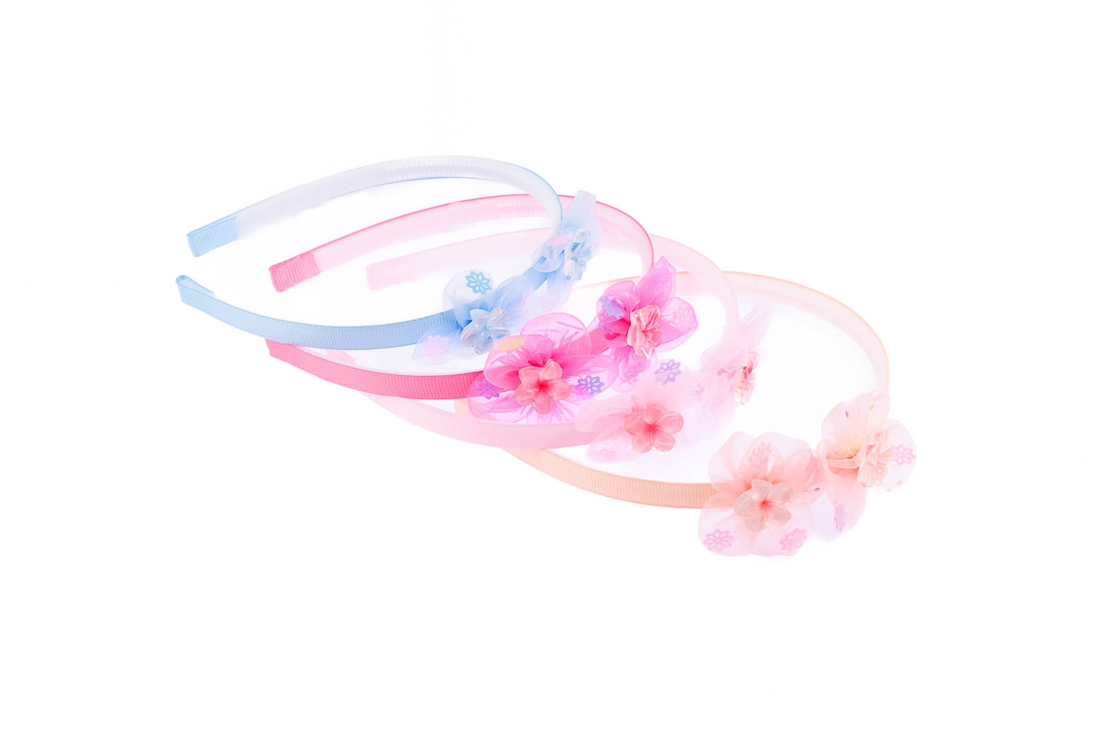 Opaska pokryta materiałem, ozdobiona materiałowymi kwiatuszkami.Zestaw skłąda się z czterech kolorów: błękitny, beżowy, jasny i ciemny różowy.