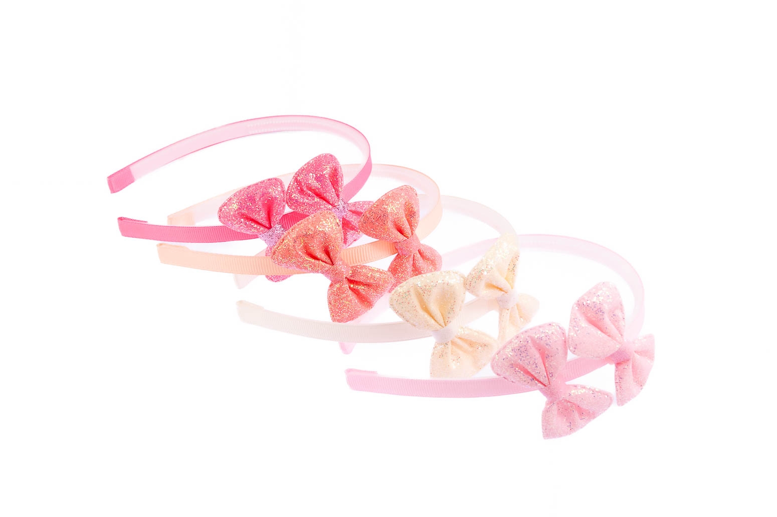 Opaska pokryta materiałem, ozdobiona materiałowymi brokatową kokardą.Zestaw składa się z czterech kolorów: biała, morelowa, jasny i ciemny różowy.
