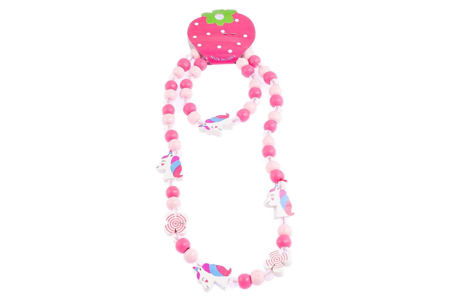 Komplet biżuterii dziecięcej, składający się z naszyjnika i bransoletki.