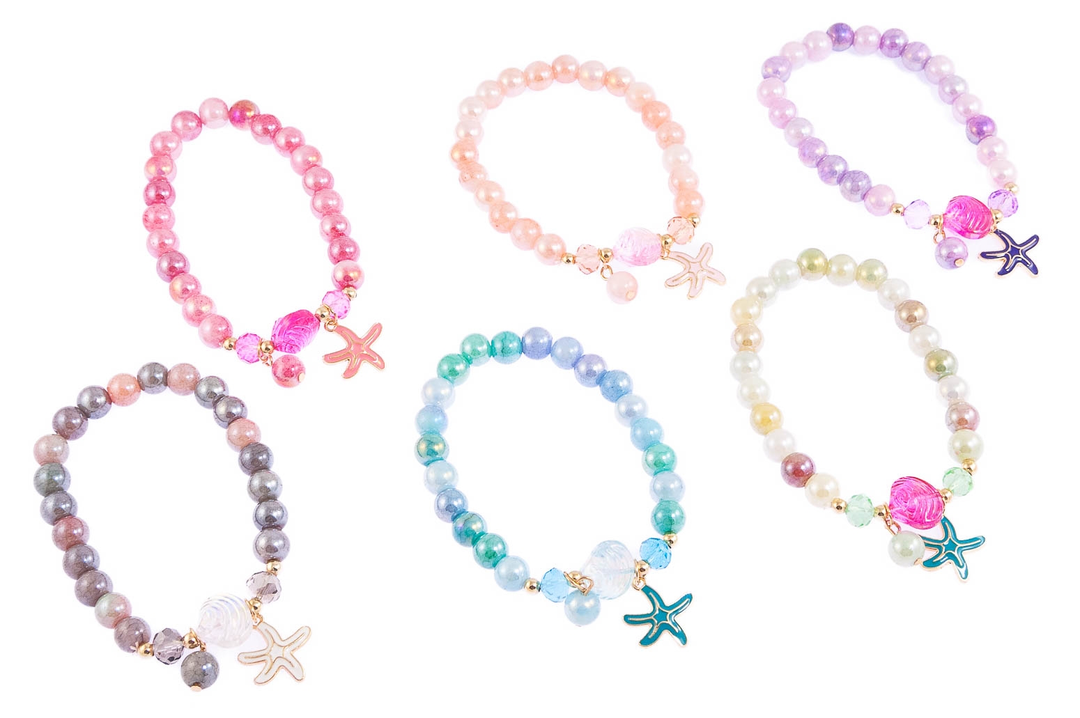Elegancka bransoletka wykonana z koralików i rozgwiazd.Zestaw składa się z sześciu kolorów: morelowy, fioletowy, różowy, zielony, niebieski i brązowy.
