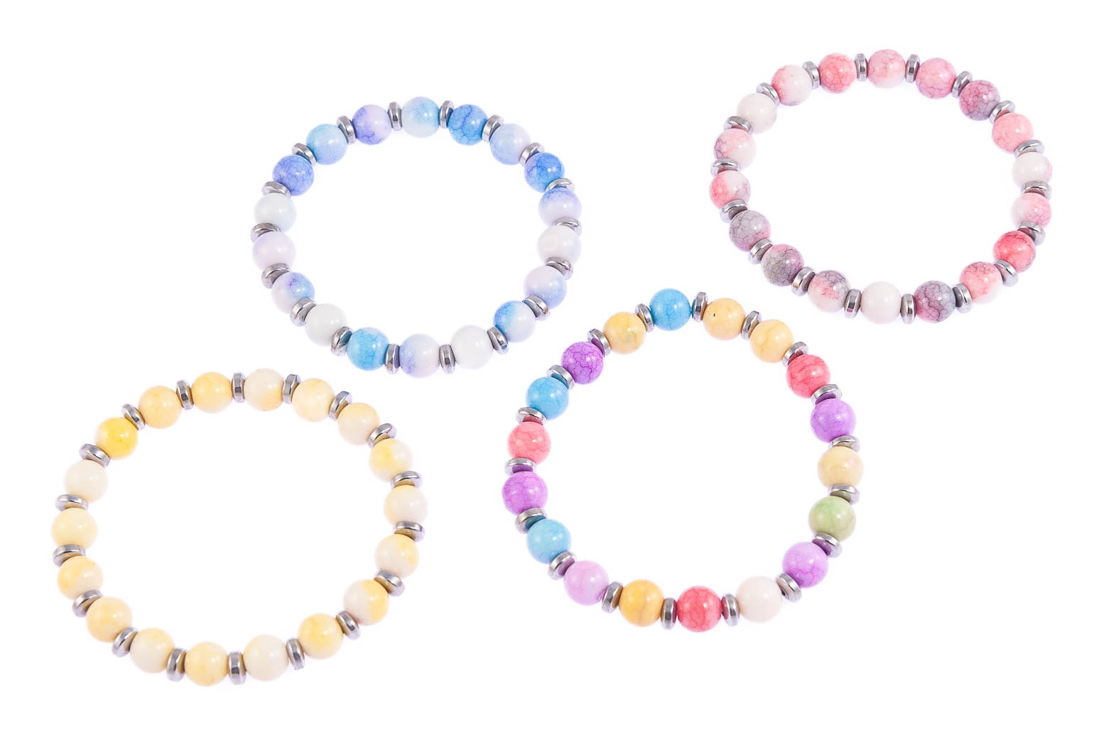 Elegancka bransoletka wykonana z pastelowych koralików.Zestaw składa się z czterech kolorów: różowy, niebieski, żółty i wielokolorowy.