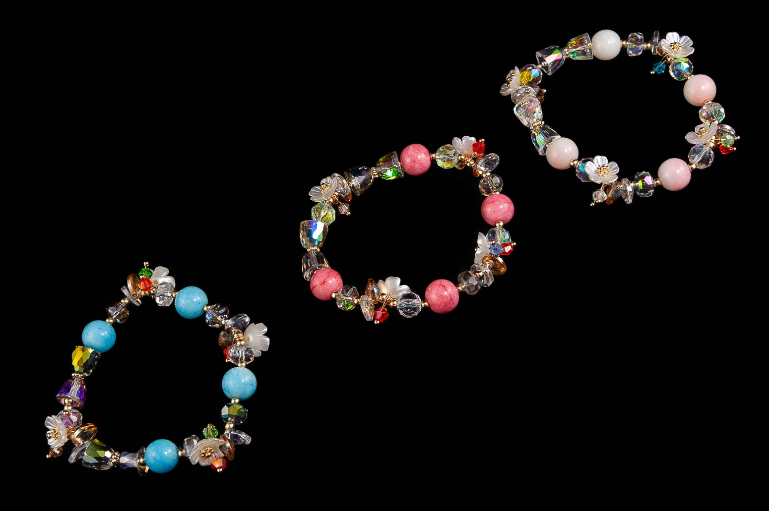 Elegancka bransoletka wykonana ze szlifowanych koralików i kwiatków.Zestaw składa się z trzech kolorów: różowy, niebieski i biały.