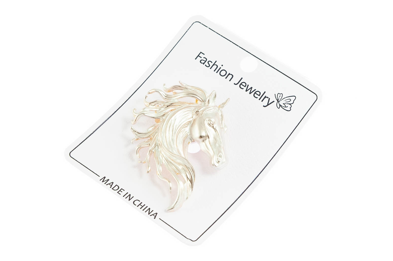 Elegancka broszka w kształcie głowy konia. Przywieszka ozdobiona białą emalią.