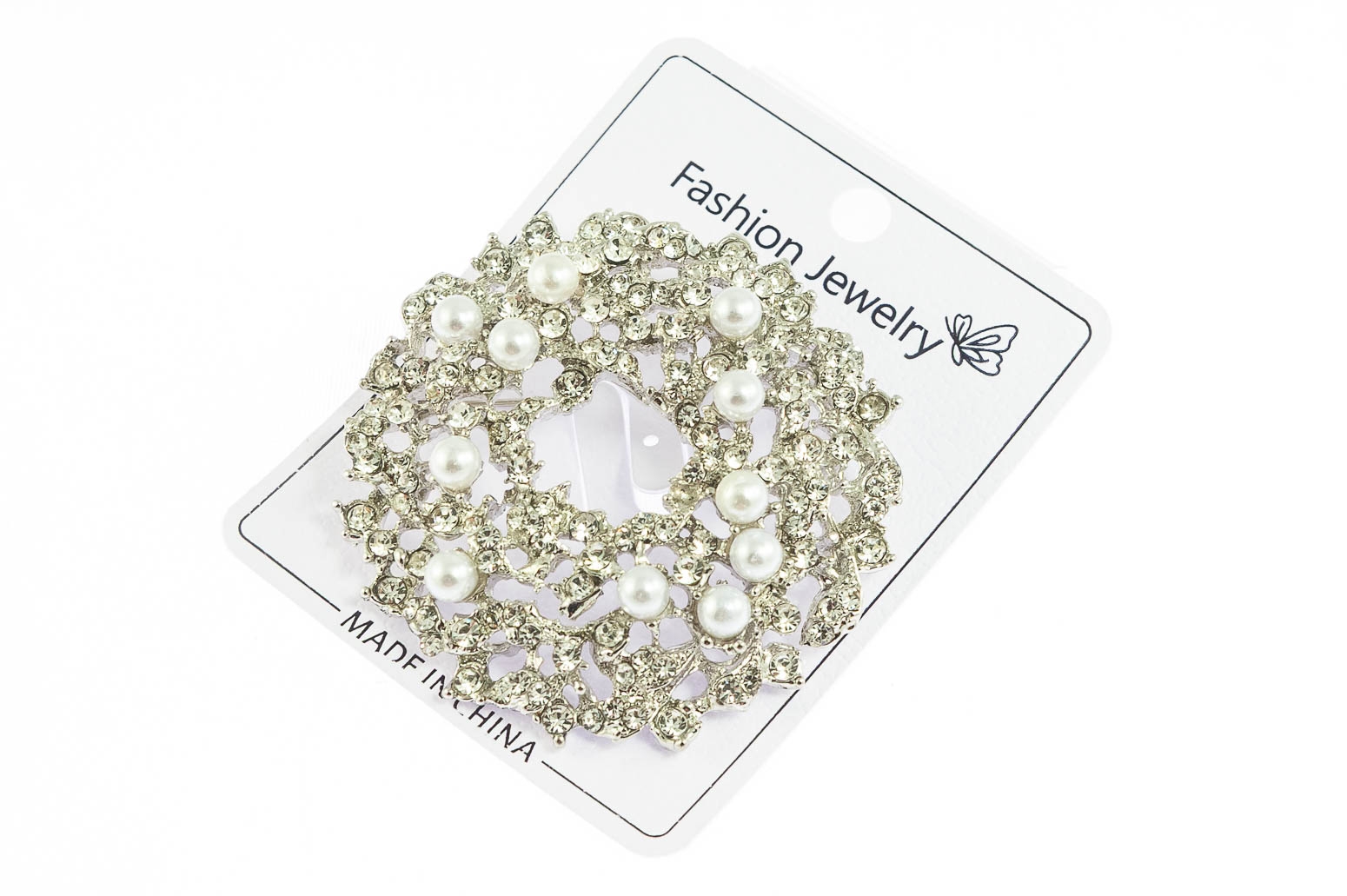 Elegancka broszka w kolorze srebrnym, ozdobiona szlifowanymi kamieniami i perłami.