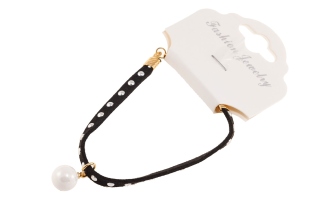 Pleciona bransoletka wykonana ze sznurka ozdobiona szlifowanymi koralikami i perełek.
