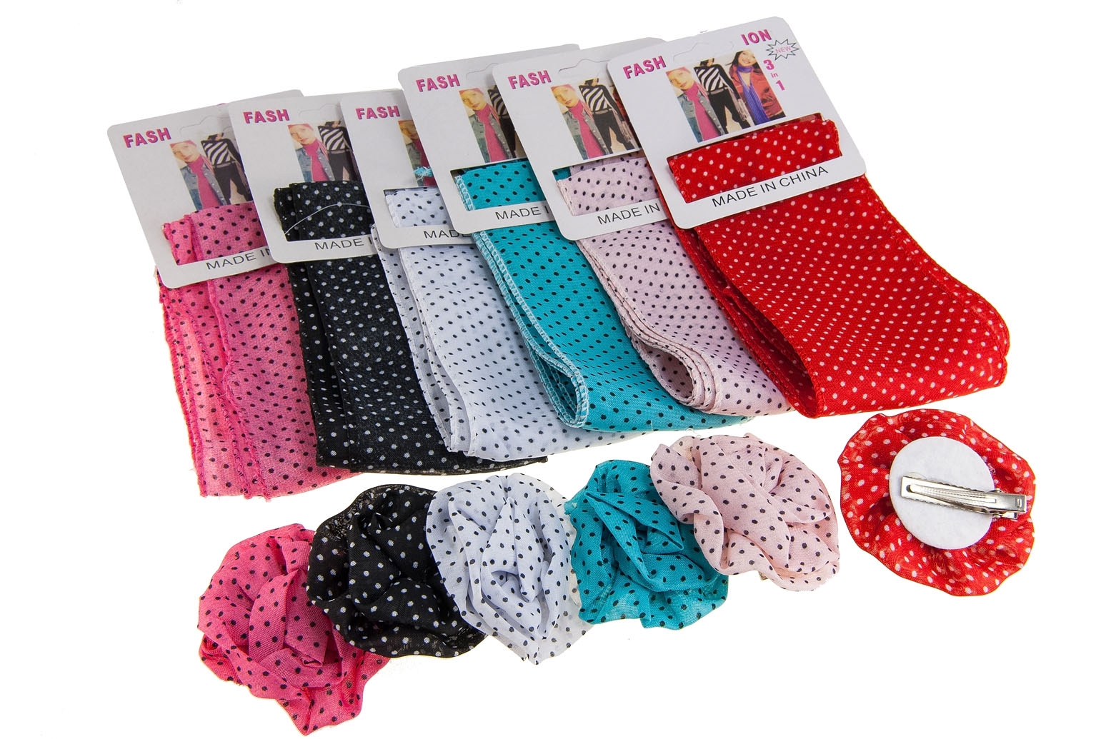 Zestaw delikatnych apaszek w kropeczki wraz z różyczkami na spince. Zestaw doda stylu i uroku każdej kobiecie.