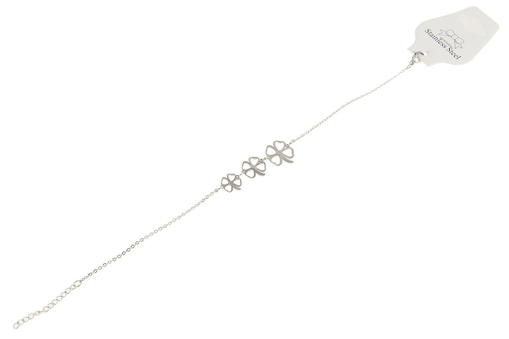 Elegancka srebrna bransoletka z ozdobnym elementem w kształcie koniczynek.