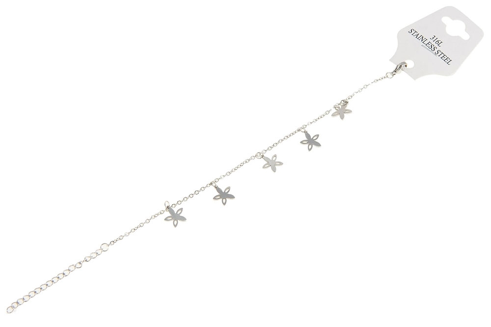 Elegancka srebrna bransoletka z ozdobnym przywieszkami w kształcie kwiatków.