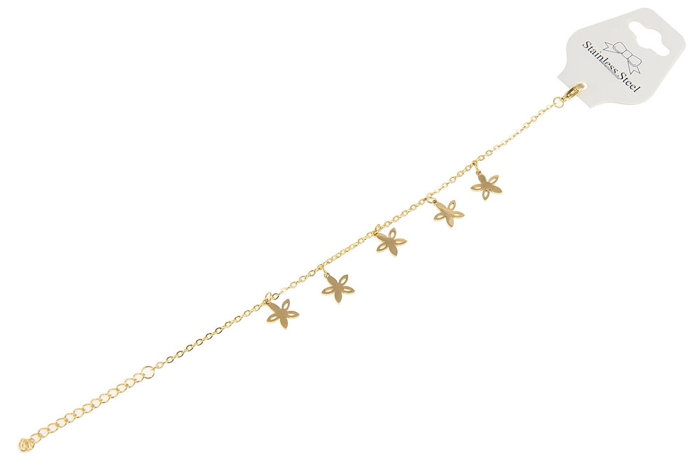 Elegancka złota bransoletka z ozdobnym przywieszkami w kształcie kwiatków.